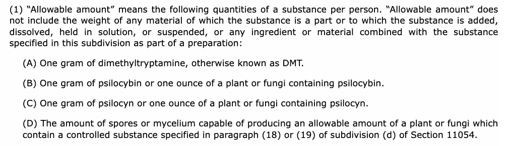 那么允许个人使用的迷幻物质的限量是多少克呢?第十章节11377.1的(g)项进行了明确规定: