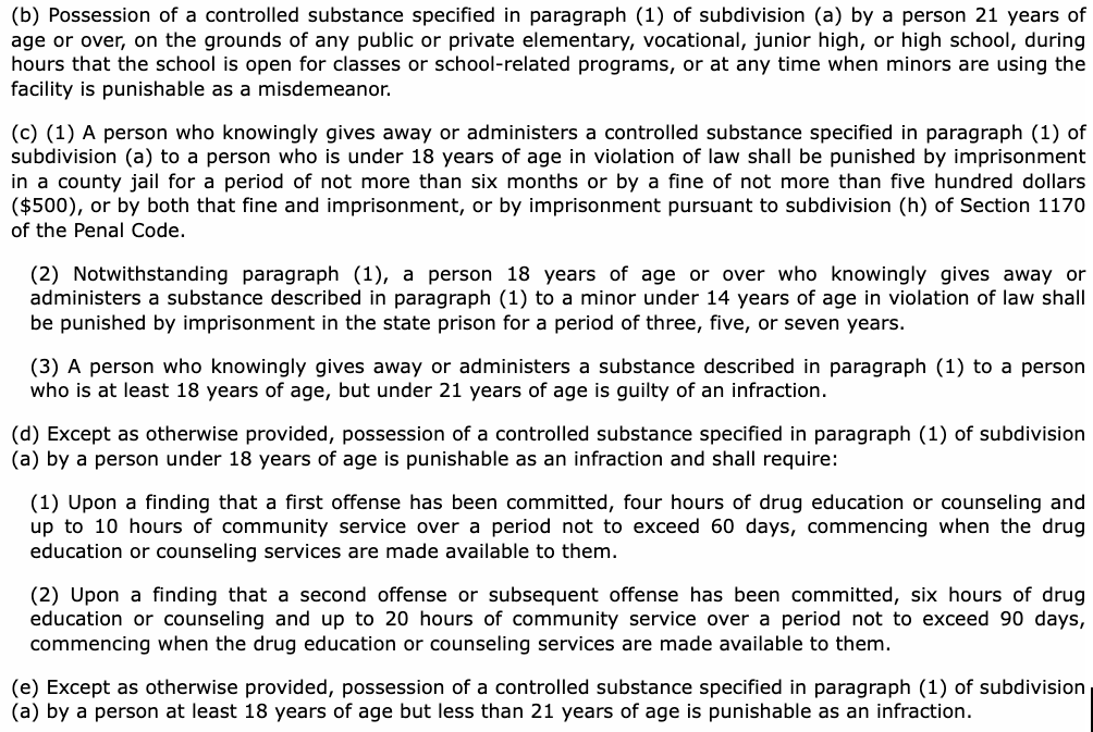 最后,该法案规定对在校园内持有以上物质、或由21岁以下的人持有或向其转让这些物质的行为进行处罚。第十章节11377.1的(b)至(e)项条文详细规范了相关处罚。包括轻罪、可能的监禁和罚金: