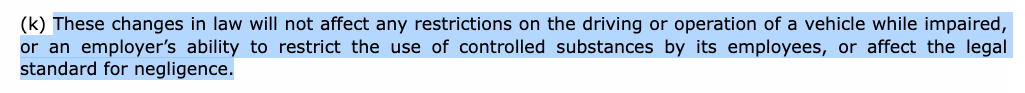 另外,第一章节中的(k)项条文明确写到:对管控药物的相关变化不会影响对使用相关药物后驾驶或操作车辆的限制,也不会影响雇主对员工使用管控药物的限制,也不会影响过失罪的法律标准。
