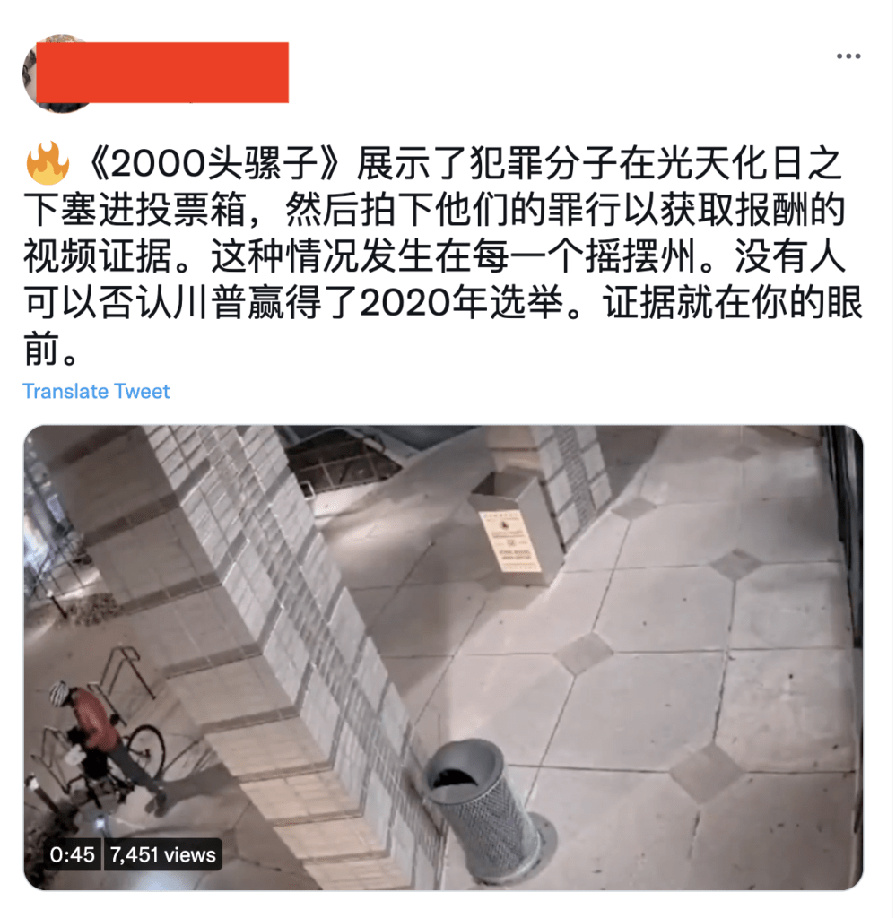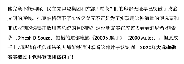 《2000只骡子》是极右翼评论员制作的纪录片,将监控片段与数据追踪进行不可靠的分析和关联,和提出猜测性但无事实支持的想法,以完成大选被盗的阴谋论叙事。中文平台上的川粉肆意传播影片中的断章取义的片段,加上看似言之凿凿的文字,再次散播大选被窃取的虚假信息。