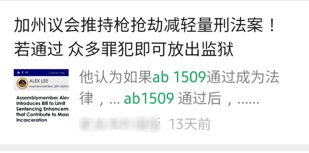 还有的文章指出“AB 1509提案主张将持枪重罪减刑,由现行法律规定的10年、20年和25年降刑至1年、2年和3年。”