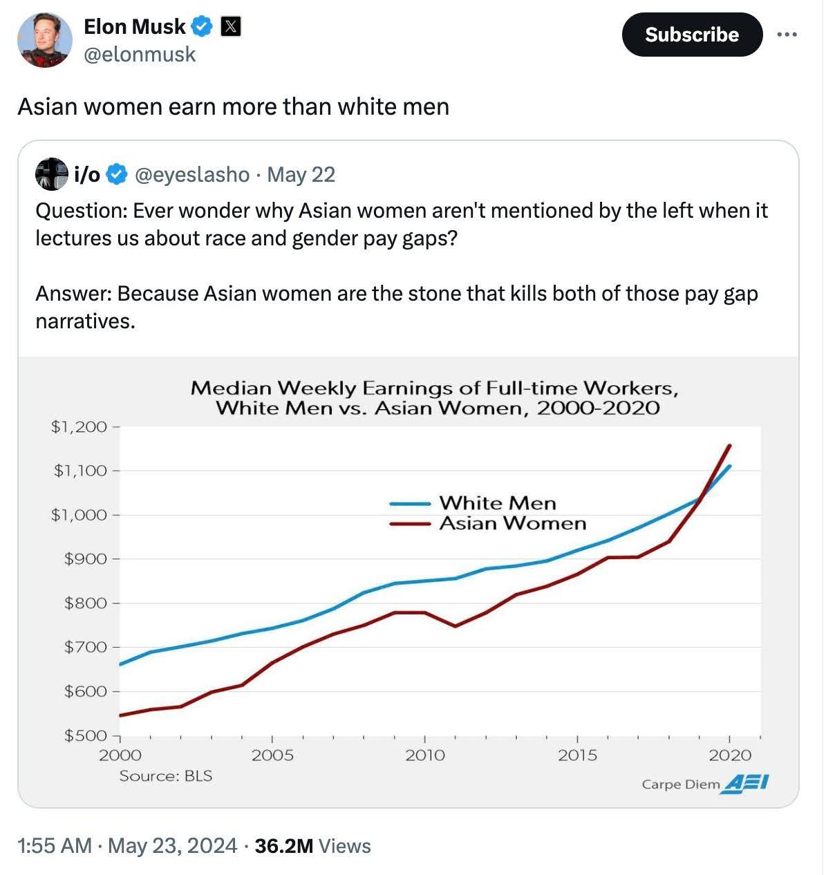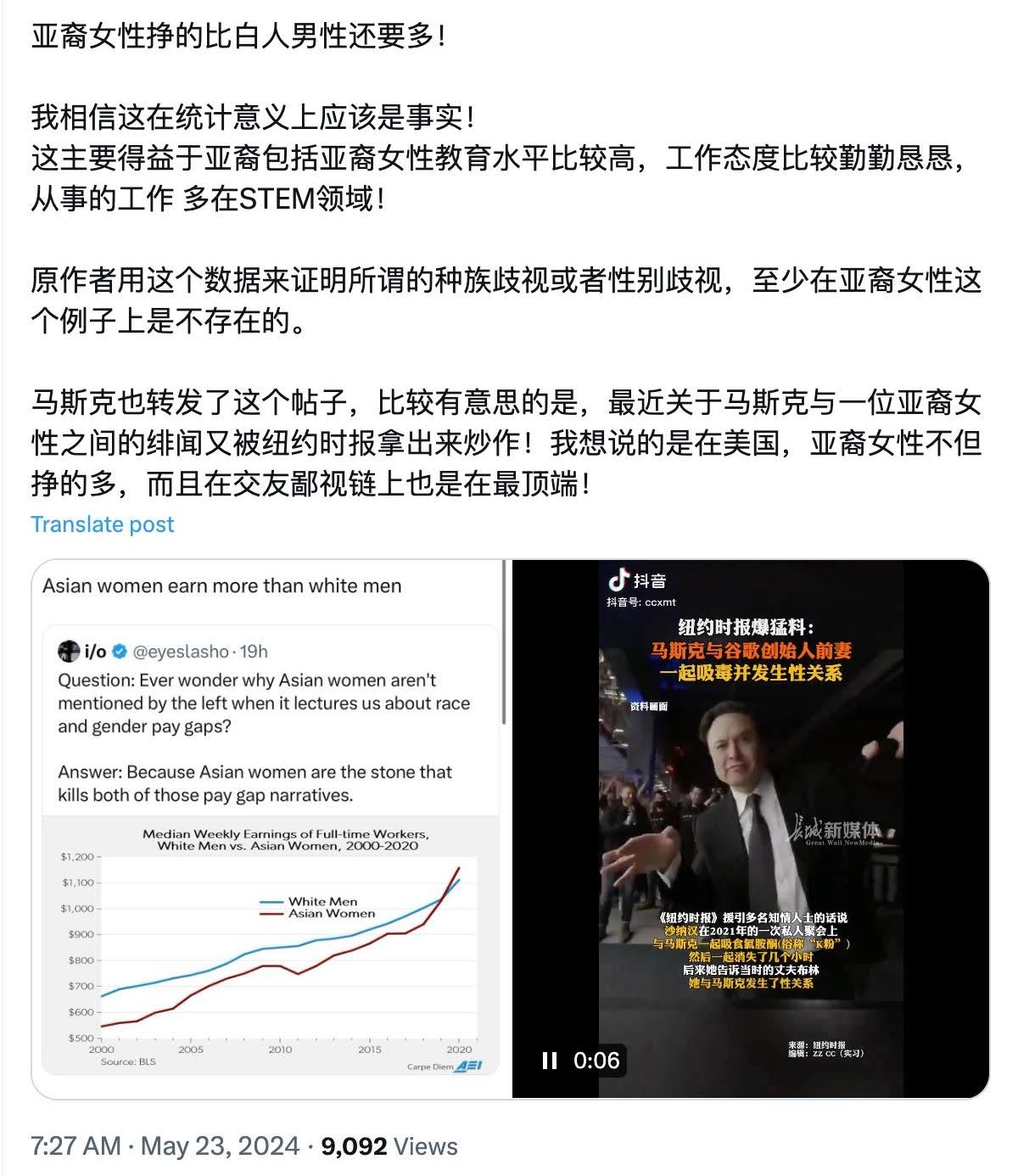 在小红书、微博等中文社交平台上,一些华人女性转发了马斯克的帖子,并自豪和庆祝自己的成就。亚裔女性确实是美国教育程度最高的群体,收入增长也是多年来不懈努力的必然结果,但人家给亚裔套上一个“模范少数族裔”的帽子,我们并不一定非得戴上去。