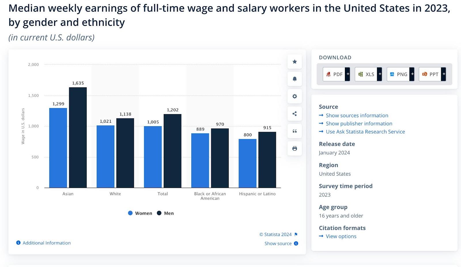 第一,亚裔美国女性的周薪中位数确实已经超过了白人男性,但两根孤立的折线缺乏太多背景;