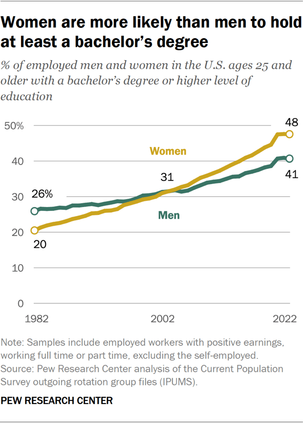 美国公众对亚裔社区的一部分看法是,这个群体的教育程度很高,而且许多从事的是具有更高竞争力的科技类(STEM)工作。总的来说,这种概括有一定的道理。平均而言,在2022年,美国总人口中只有三分之一不到的人拥有大学学位,而亚裔美国人中的这一比例为72%;在这当中,女性新获得大学学位者更多,这一趋势和各个种族是一致的。