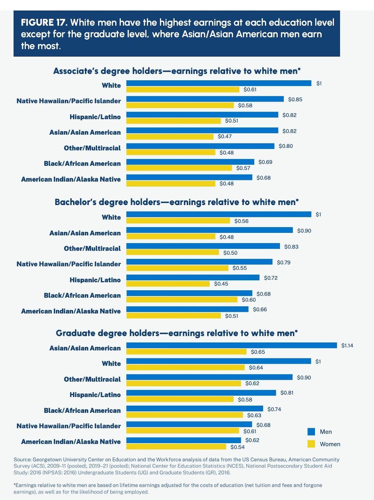 是的,现在亚裔女性的收入终于超过了白人男性,但代价是多年的勤奋学习和先期教育投资。但如果是按同样的学历来比较呢?乔治城大学2024年发布了一份详细的研究,结果触目惊心:在各类不同的教育程度中,白人男性基本上都是赚得最多,只有一项例外,在硕士以上学历中,亚裔男性比白人男性赚得多。所以,如果是按学历来比,高收入人群中就没有亚裔女性什么事了。