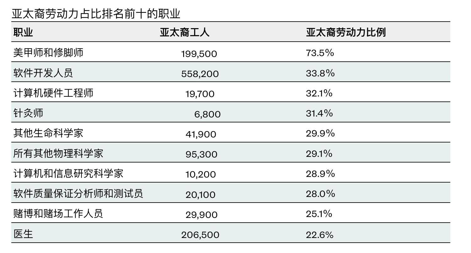 这一趋势也反映在AAPI工作者所从事的工作类型上。大约三分之一的软件开发人员和计算机硬件工程师是亚太裔。同时,亚太裔占医生、生命科学家和物理科学家的近四分之一。但与此同时,亚太裔也大量从事服务业。