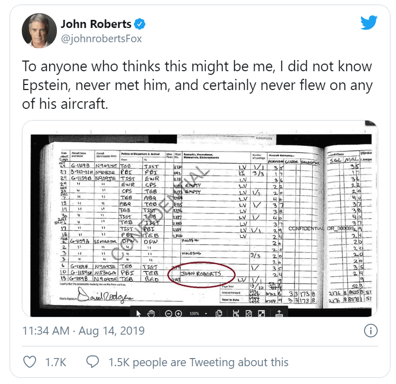 而所谓的飞行记录上有Roberts的名字。这个飞行记录是从一个562页的起诉Epstein的文件中摘录出来的。除了这个名字以外再也没有别的任何证据能够指控Roberts跟爱泼斯坦有染了。而这个名字的出现,是因为重名。要知道John Roberts是一个非常常见的名字。