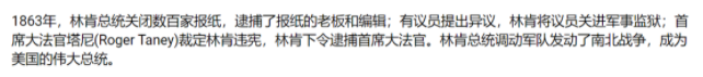 谣言说大法官裁定“林肯发布中止人身保护令违反了宪法”,裁定林肯违宪。林肯听说了以后,就逮捕了该名首席大法官。