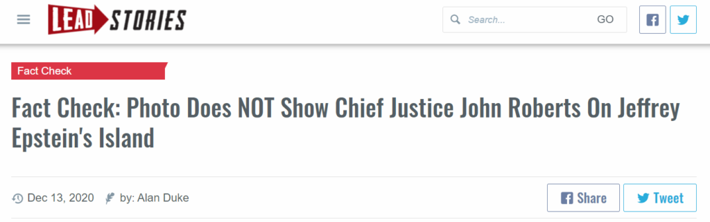 根据事实查证网站Leadstories的查证,这张指控克林顿和大法官Roberts在Little St. James岛上的照片,其实是克林顿2017年在多米尼加共和国的照片,Roberts则并没有参与。仅圈出一个面部看不清的男性就张冠李戴,就是一种不负责任的移花接木。