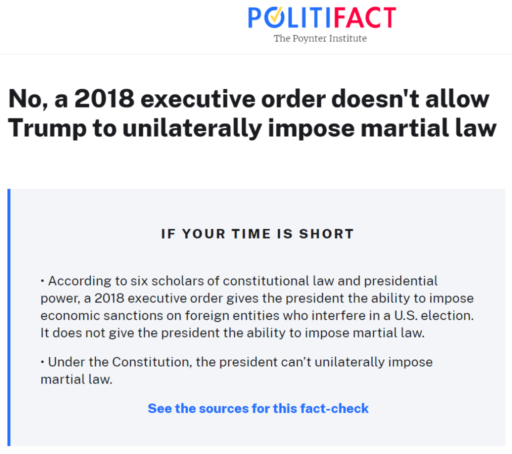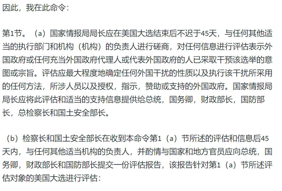 另外,还有人提到2018年川普发布的一条行政命令,称总统可以依据该命令实施戒严、军管等。然而,我们在白宫网站查阅到了这份行政命令,该行政令指的是为防范外国势力干涉美国大选,美国要采取反制措施,要求在大选结束之后45天,由国家情报局的局长提交一份报告,看看有没有外国势力干涉美国大选。