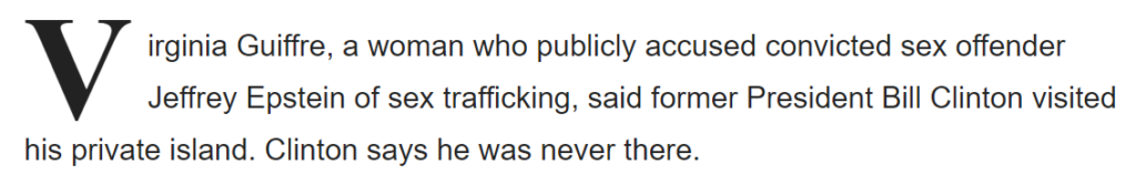 Netflix还专门拍了一个关于爱泼斯坦的四集记录片,叫做肮脏巨富(Filthy Rich)。片子里Viginia Giuffe指称克林顿上过爱泼斯坦的小岛。