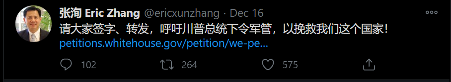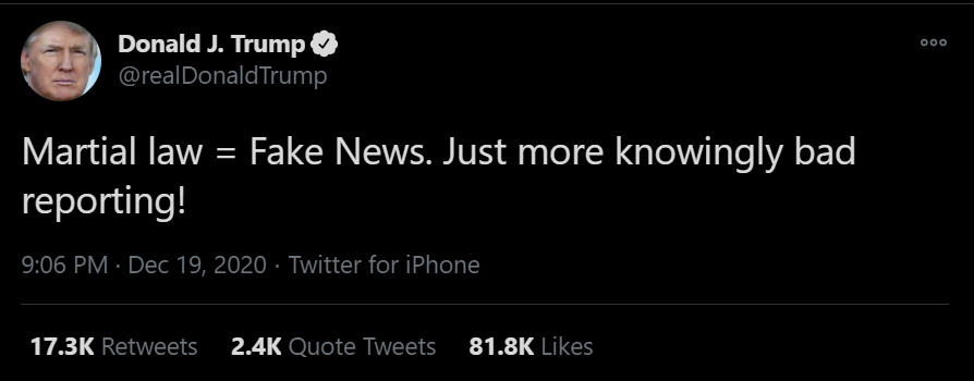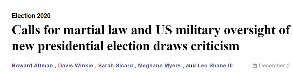 这些说法呼应川普支持者的极端呼吁:鉴于未经证实的指控,即选民欺诈使乔·拜登胜选,总统实施戒严令。