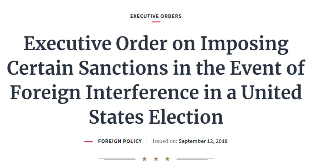 在他讲话时,“在美国大选中出现外国干涉事件时实施某些制裁的行政命令”中的文字在屏幕上闪烁。