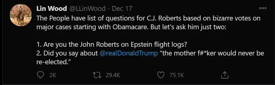 本周四12月17日,川普和QAnon的支持者,行为艺术家、韭菜收割机林伍德老师,哦不对,是律师。在推特上把矛头指向了最高法院保守派的首席大法官John Robert。质疑他的有两点。第一条是问他是不是上过离奇死亡的爱泼斯坦的飞机。第二条是说Roberts在一个去年9月跟另一位法官Stephen Breyer的电话中说,要让川普出局。