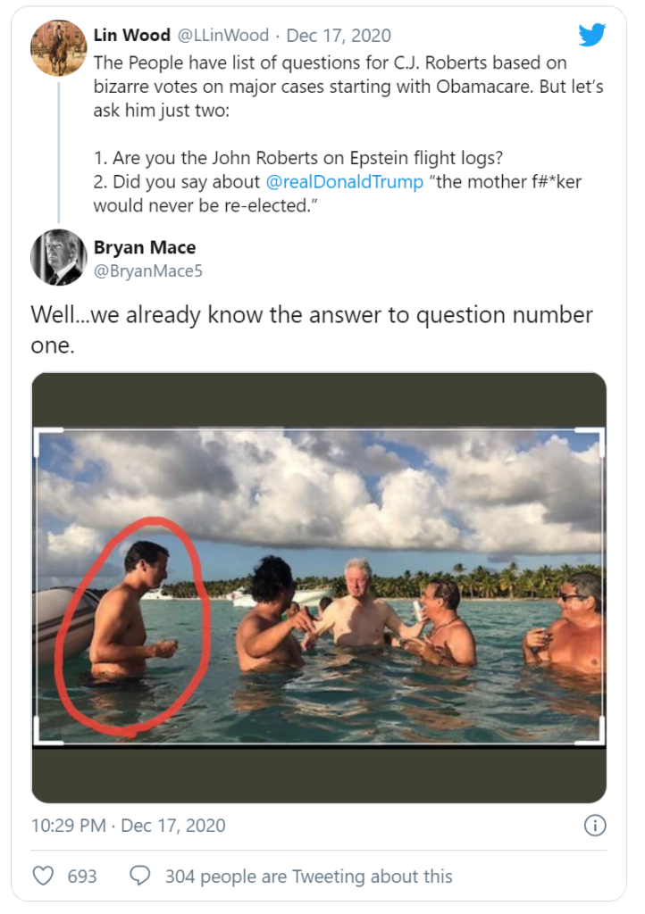 上面之所以提到克林顿,是因为昨日林伍德律师指控大法官Roberts有牵扯爱泼斯坦的飞行记录。有好事者就贴出了一张声称是克林顿和Roberts在一起游泳的照片,暗示,Roberts跟克林顿一起在爱泼斯坦的岛上玩乐。
