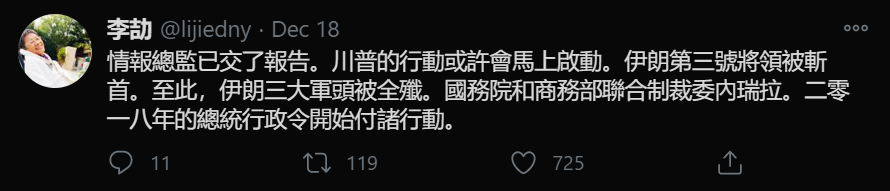 不过,保守派电视节目主持人扎克·德鲁(Zach Drew)在Facebook视频中说:“可能会在本周五之前,实行戒严令或非常类似的事情。” “我说的是国家情报局局长约翰·拉特克利夫(John Ratcliffe)援引2018年行政命令。”