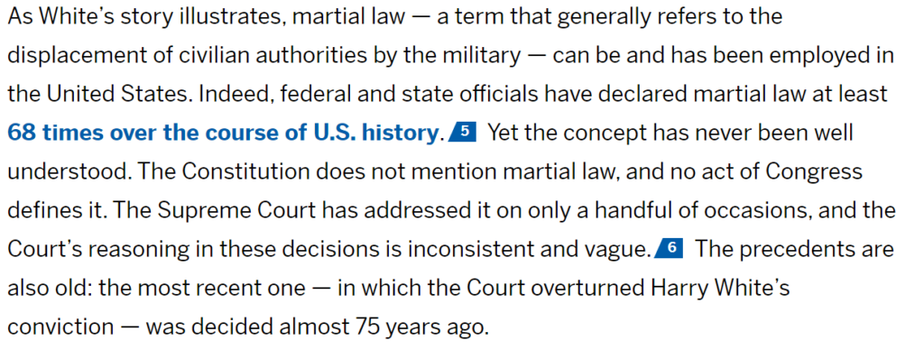 另一方面,美国宪法对军事管制并没有解释,也就是美国没有军管法,但是有《叛乱法》(Insurrection Act)。美国历史上,联邦政府或者州政府的,一共有68次实行过军事管制。美国宪法虽然没有军事管制的明确定义,但是有法律限制军管范围的《治安官动员法》(Posse Comitatus Act,简称PCA)。