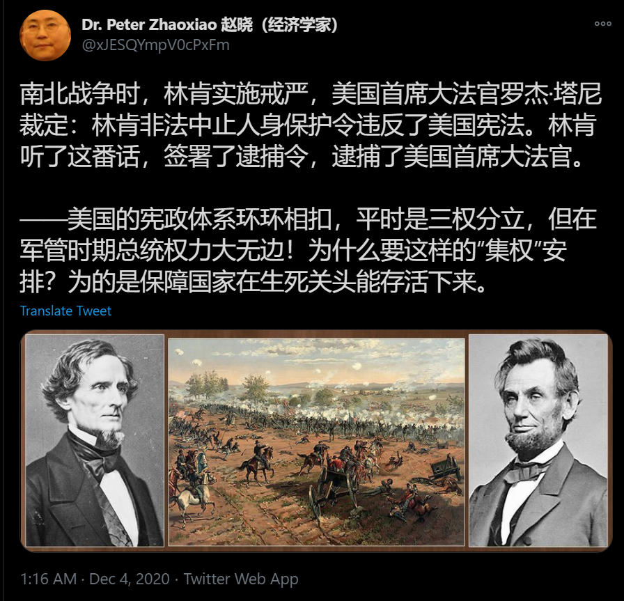 更有甚者,除了呼吁军管,还有人举林肯的例子,说总统可以下令逮捕大法官