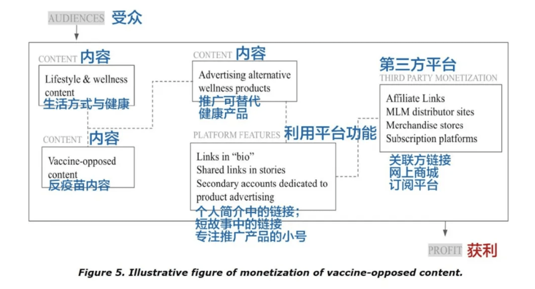 与Alex Jones类似,这些博主发布的反疫苗阴谋论,主要目的是制造恐慌与焦虑,在这之后,就开始推广一些所谓的“自然保健品”,鼓励粉丝购买,完成韭菜收割。Moran团队专门绘制了下面这样的利益转化图来揭示这些反疫苗网红的经济链路。
