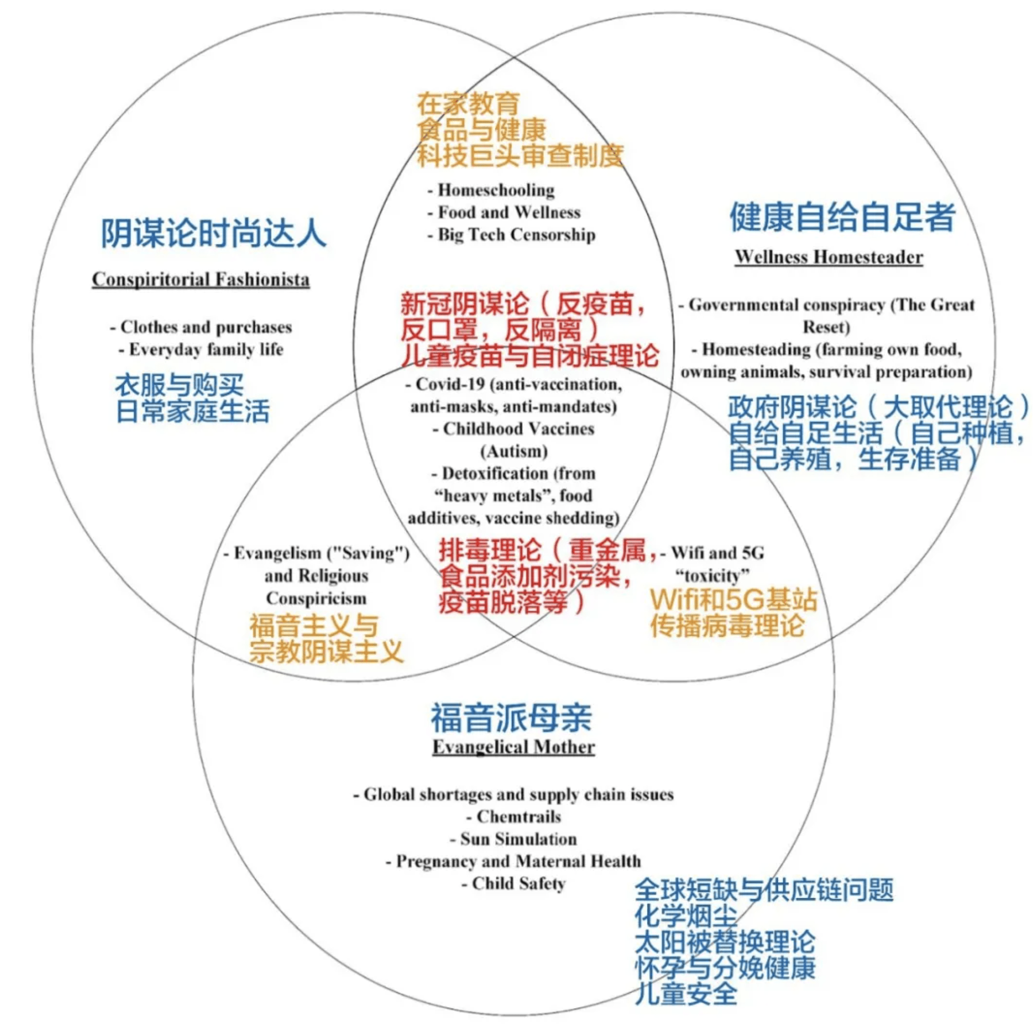 这些阴谋论内容主要体现在三个大圆互相有交集的地方,包括与新冠病毒及疫苗有关的阴谋论、儿童注射疫苗导致自闭症、自然排毒法、大型科技公司的审查制度、Wifi和5G有毒论等等。尽管Instagram平台2021年对反疫苗内容进行过监管升级,但这些博主也会巧妙地利用系统监管的漏洞继续发布相关内容。