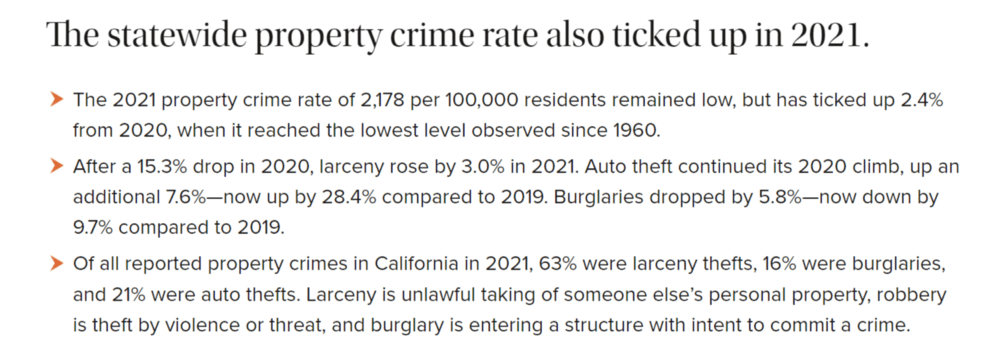 上图中的数据显示,2021年的财产犯罪率为每10万居民2178人,仍然是维持低水平,但比2020年上升了2.4%,而2020年是达到了1960年以来的最低水平,比上一年下降了15.3%。2021年的盗窃案上升了3.0%。从大趋势看,虽有小幅波动,但是总体趋势还是常年下降。从财产犯罪的统计上看,看不到2014年之后有攀升的事实。