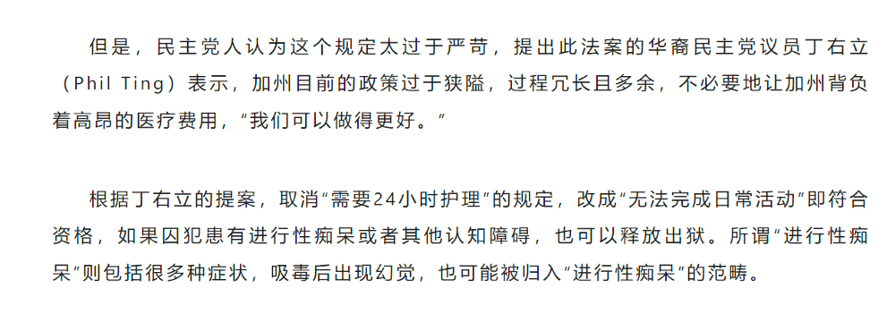 再来说说前面造谣文里面说的提前释放有病的犯人。这个法案叫做AB960,由来自三藩市的民主党籍州众议员丁右立(Phil Ting)提出,叫做体恤性释放,就是对绝症犯人临终关怀的法案。