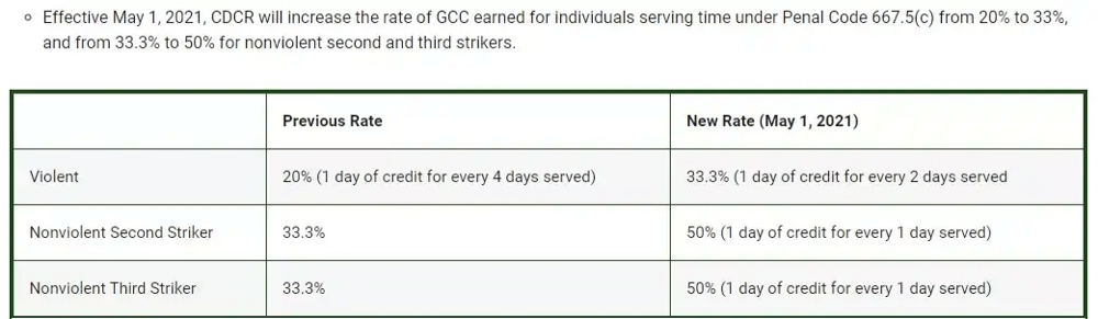 这项政策说的是加州的监狱调整了服刑犯人的积分系统,该系统的主旨是,如果在监狱服刑期间表现良好可以获得减刑。调整之后的政策是,从服刑四天可以获得减刑一天,变成了服刑两天就可以减刑一天。这样刑期减少的幅度就更快了。