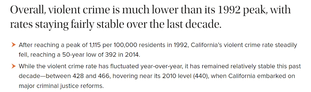暴力犯罪和财产犯罪,是分开统计的。在1992年达到每10万居民1115宗犯罪的峰值后,加州的暴力犯罪率常年下降,在2014年达到了50年最低的392宗。