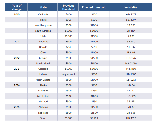 而且950元以下不入罪,这种说法本身就不对。这个法案说得是盗窃金额在950以下不算重罪(felony),而算轻罪(misdemeanor),并不是950以下就无罪。况且这个法案本身并没有包括砸车和入室行窃这一类的财产犯罪。这个法案跟暴力犯罪有更加没有什么关联。而且这个划分轻罪重罪的界限各个州都有。德州划的这条线在2500元。