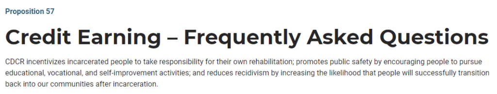 积分奖励制度来自于2016年公投通过的加州57号提案(Prop 57)。2016年11月,加州选民以压倒性优势通过了第57号提案,即《2016年公共安全和改造法案》。根据第57号提案,加州惩教部(California Department of Corrections and Rehabilitation)为了激励被监禁者对自己的改造负责,为鼓励持续的良好行为,提供了获得积分的机会,同时也鼓励积极参与监狱内的各项计划和活动。