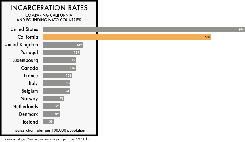 截止2018年,加州10万人监禁581人,少于美国平均的698人(排美国前三位的是俄克拉荷马1079人,路易斯安娜1052人,密西西比1039人)。当然,由于美国的刑罚系统在发达国家里很特殊,所以加州这个数字依然还是太高。