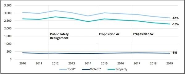 青少年和刑事司法中心(Center on Juvenile and Criminal Justice)去年9月发布的一份概况说明发现,2019年加州的犯罪率比前一年下降了3%,达到了该州50年前开始编纂这些统计数据以来的最低水平。在过去的十年里,在重大的刑事司法改革中,犯罪率继续稳步下降,包括一些减少监狱和监狱人口以及减轻对低级别犯罪的惩罚。