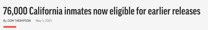 而符合条件的罪犯有7万6千名。于是媒体报道说,加州正在给7.6万名囚犯,包括暴力犯和重刑犯,提供提前出狱的机会,因为该州旨在进一步削减曾经是美国最大的州立惩教系统的人口。