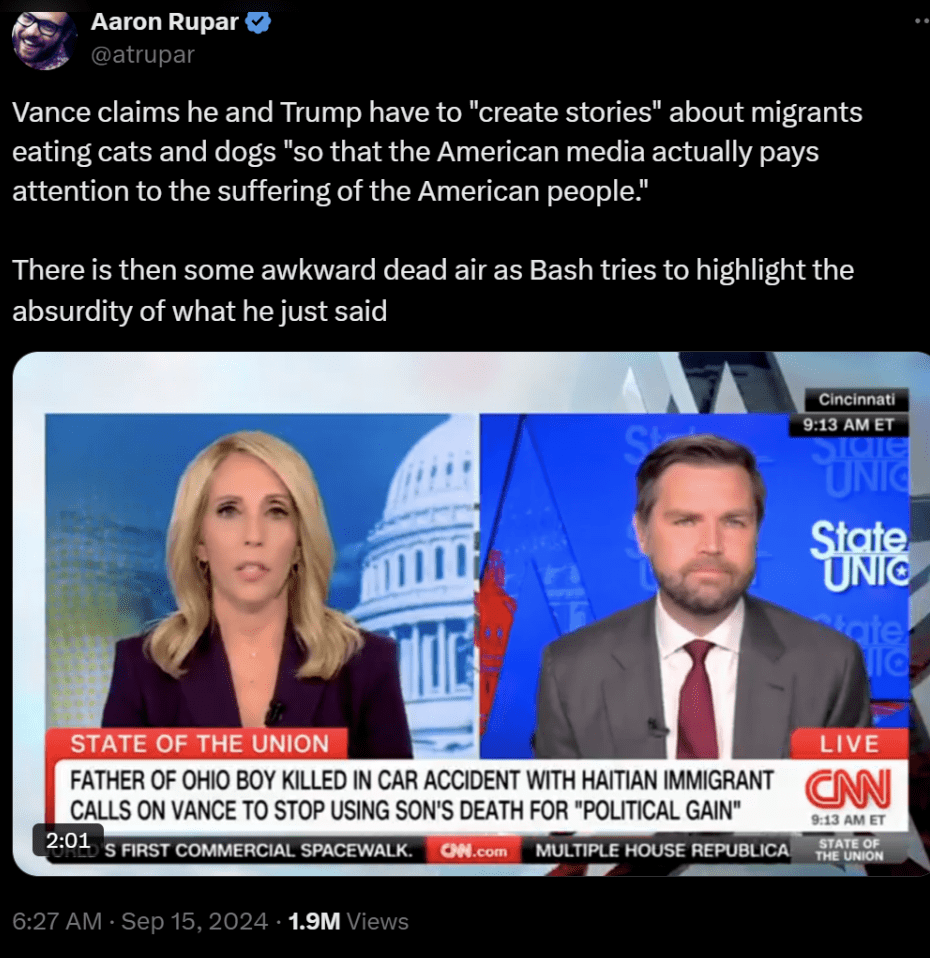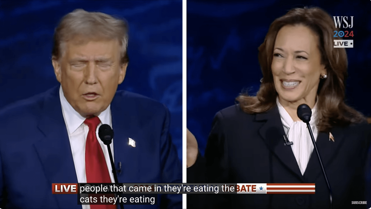 精英们的入局和这些表情包进一步助推了相关信息在社交媒体上的传播。而到了9月10日晚,川普和贺锦丽辩论时,他直接把相关言论在万众瞩目的辩论现场说了出来,让这则信息突破了右翼的回音壁,完成破圈,成了全国关注的话题。