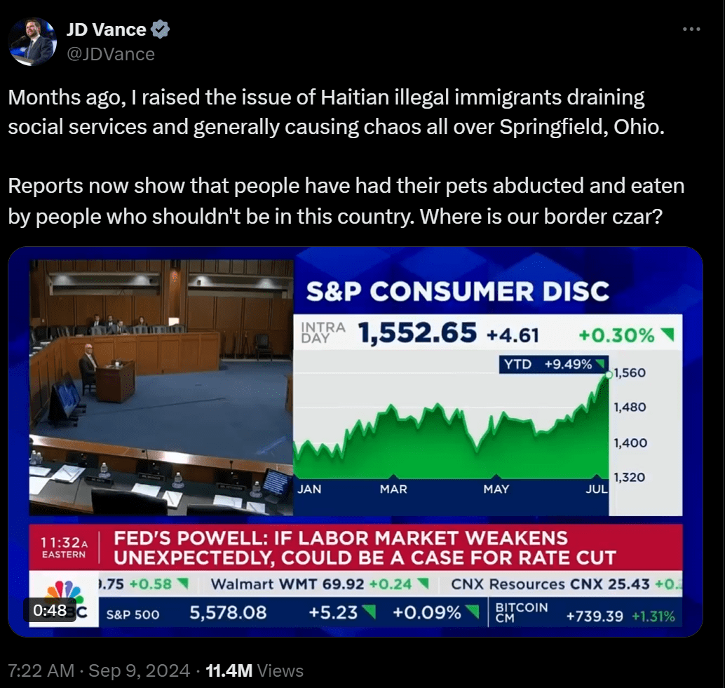 本周一,俄亥俄州参议员、川普的竞选搭档JD·万斯在X上发帖称,“现在有报告显示,有人绑架并吃掉了他们的宠物,而这些人本不该出现在这个国家。我们的边境‘沙皇’(指贺锦丽)在哪里?”