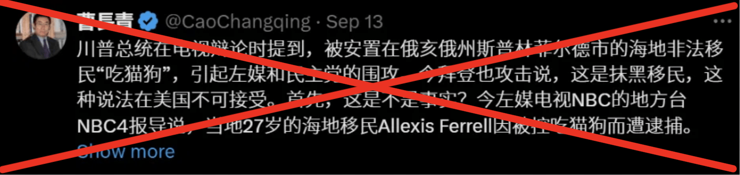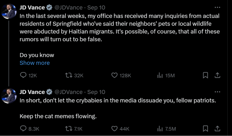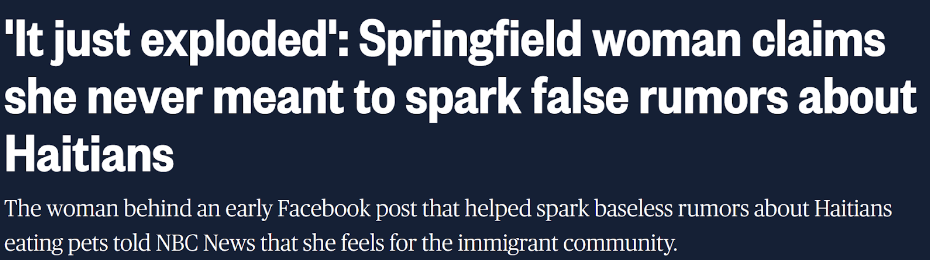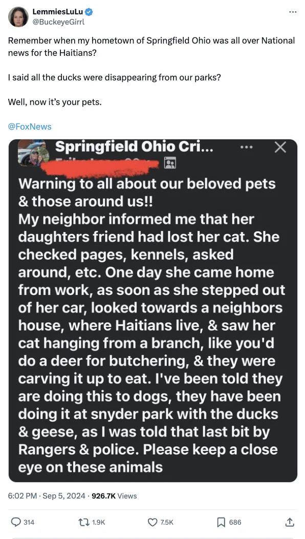 9月5号开始,X上开始出现了一则来自于Facebook群组帖子的截图,该原始帖子说:“我的邻居告诉我,她女儿的朋友丢了猫。她查看了网页、狗窝,四处打听。有一天,她下班回家,刚从车里出来,就朝居住在邻屋的一户海地人家看了一眼,看到她的猫挂在树枝上,就像屠宰鹿一样。他们正在把它剁碎吃掉。有人告诉我,他们也在对狗做这种事,在斯奈德公园,他们一直在对鸭子、鹅做这种事。这是护林员和警察告诉我的最后一件事。请密切关注这些动物”。