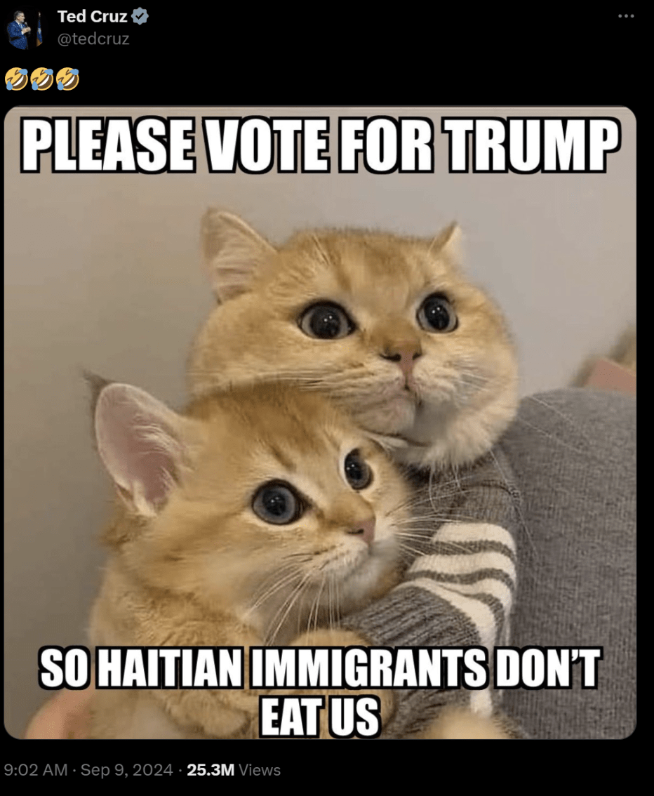 万斯所说的表情包,是右翼用户通过AI生成的一系列宠物图片。比如下面这张参议员泰德·克鲁斯发布的图片。图片的意思是“请给川普投票,这样海地移民就不能吃我们了”。