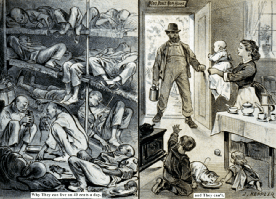 这样的宣传海报,赤裸裸地将华人与白人区分开,并进行了非人化的丑化,为当时建立全社会的排华共识制造舆论基础,这跟二战时希特勒把犹太人送进集中营的逻辑也是一致的。