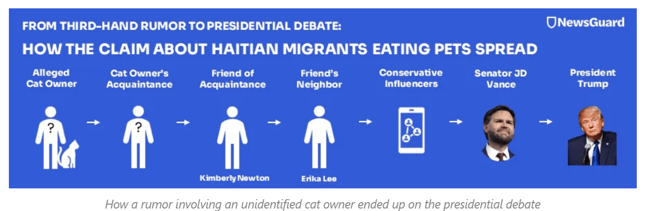 根据NewsGuard制作流程图,这件事的发酵路径是这样的:据称是熟人的猫的主人->纽顿的朋友->纽顿->李(李在 Facebook 上发布了该帖子)->保守派网红大V->万斯->川普。