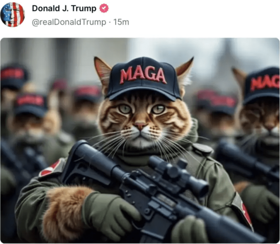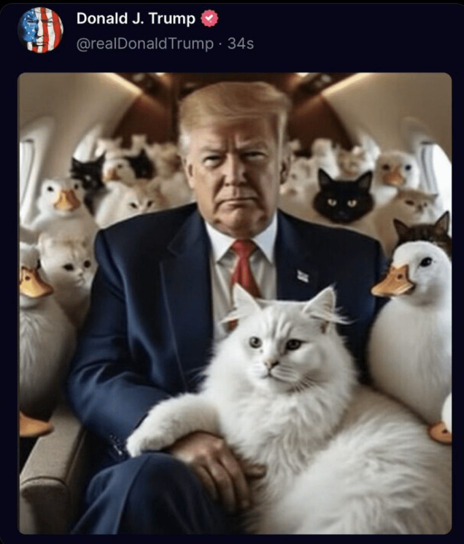 而川普本人在与贺锦丽辩论前几小时,在社交媒体上发布了两张相关AI图片,其中一张川普被猫和鸭子包围,而另一张照片则展示了戴着MAGA帽子的武装猫。