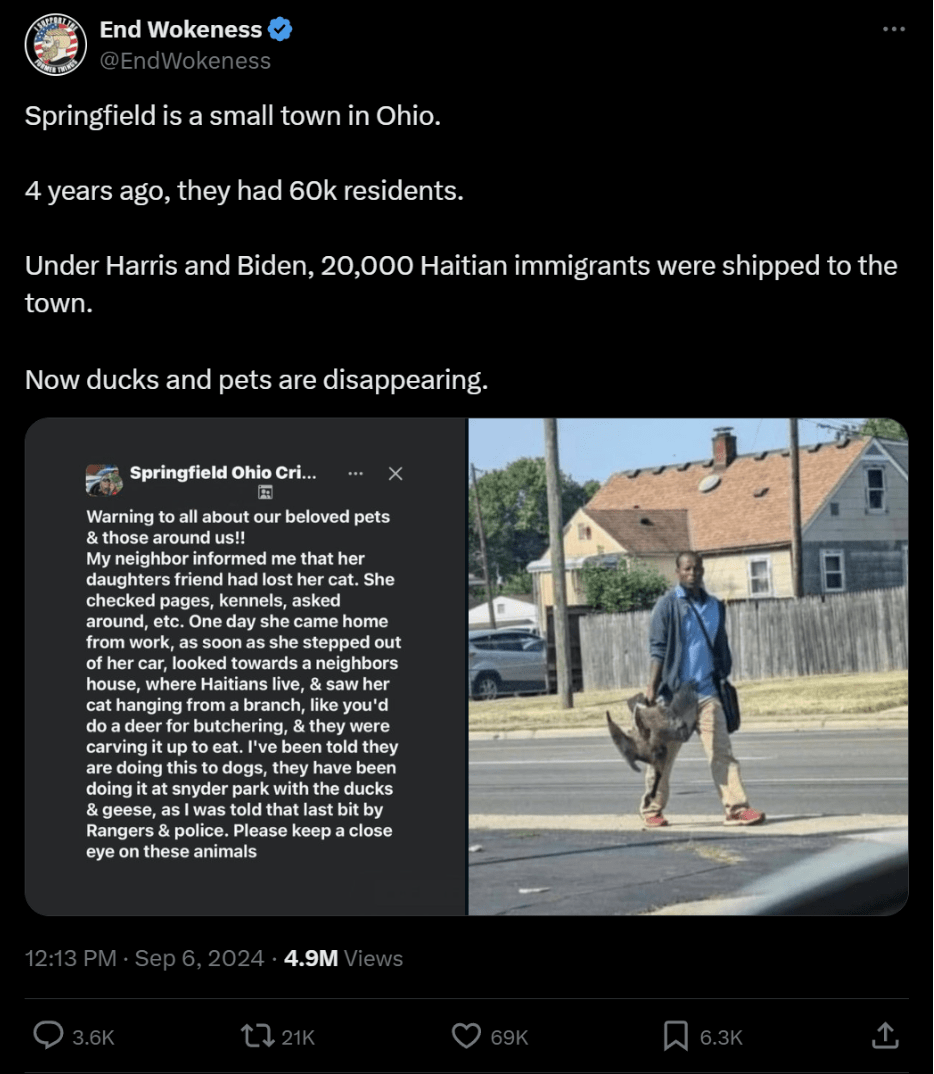 有290万关注者的右翼账号End Wokeness发文称,“斯普林菲尔德是俄亥俄的一个小镇,4年前,这里只有6万居民。拜登-贺锦丽任上,2万海地移民涌入了这里。现在鸭子和宠物消失了”。其引用的内容是上文提到的屏幕截图。附带的另一张照片显示,一名黑人男子正提着看起来像鹅的东西。这个帖子在社交媒体上有几百万点击,并被不断分享。