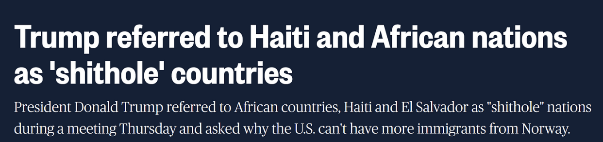 川普过去曾多次这样干,在担任总统期间,川普质疑为什么美国要接纳来自海地和非洲一些“烂地方”(shithole)的人。他在2024年的竞选活动中重点关注非法移民问题并在演讲中也经常提到移民犯下的罪行,并称他们都是罪犯。他认为移民是导致美国犯罪和吸毒率上升以及占用美国公民资源的原因。