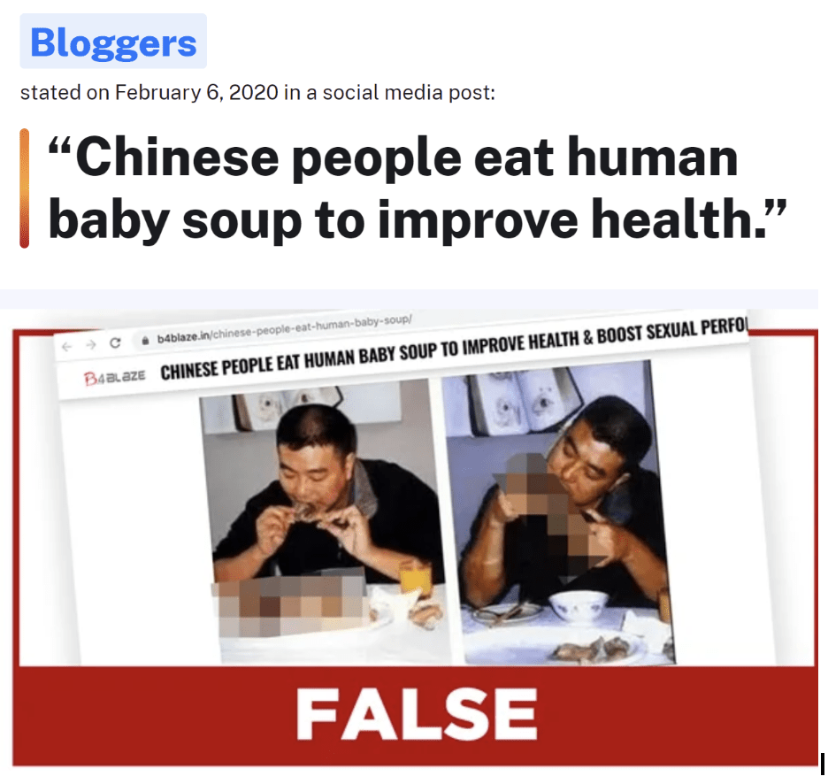 不知道读者是否还记得,在2020年初新冠刚刚开始的时候,在互联网上就流传过中国人吃小孩的病毒式传播的帖子。该文章标题写道:“中国人吃人婴汤改善健康”。截至2020年2 月 10 日,Facebook 上 1 月 30 日的帖子已被浏览了 4600 多万次,帖子中的图片显示,一名男子坐在桌旁,准备吃下疑似人体的东西。因为已经过了四年,原文已找不到,只能从事实核查网站找到原文的蛛丝马迹。