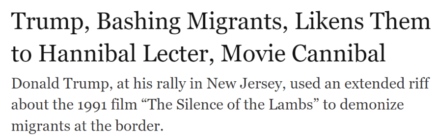 据《纽约时报》报道,在最近的一系列选举造势演讲中,川普一直强调移民会毒害我们的血液,移民不是人,是动物。川普还将移民比作《沉默的羔羊》中的食人者汉尼拔·莱克特(Hannibal Lecter)。归根结底,这两种指控都有一个共同点:这些外来移民跟我们不一样,是野蛮人,非人类。
