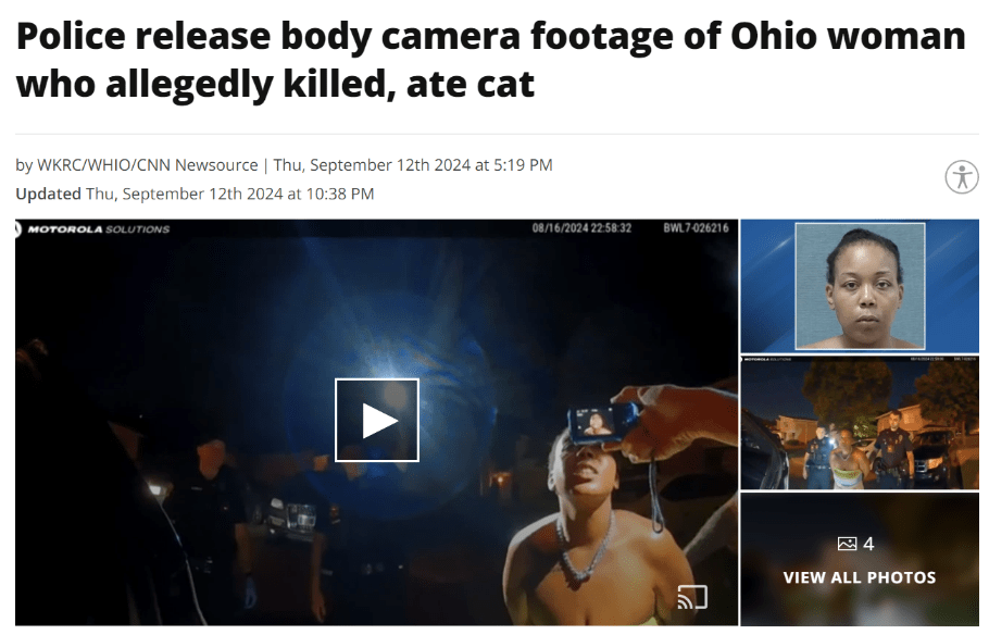 总统辩论后,吃宠物话题被引爆,随后一则某人被警察抓住杀死宠物猫的视频又开始在社交媒体上传播。