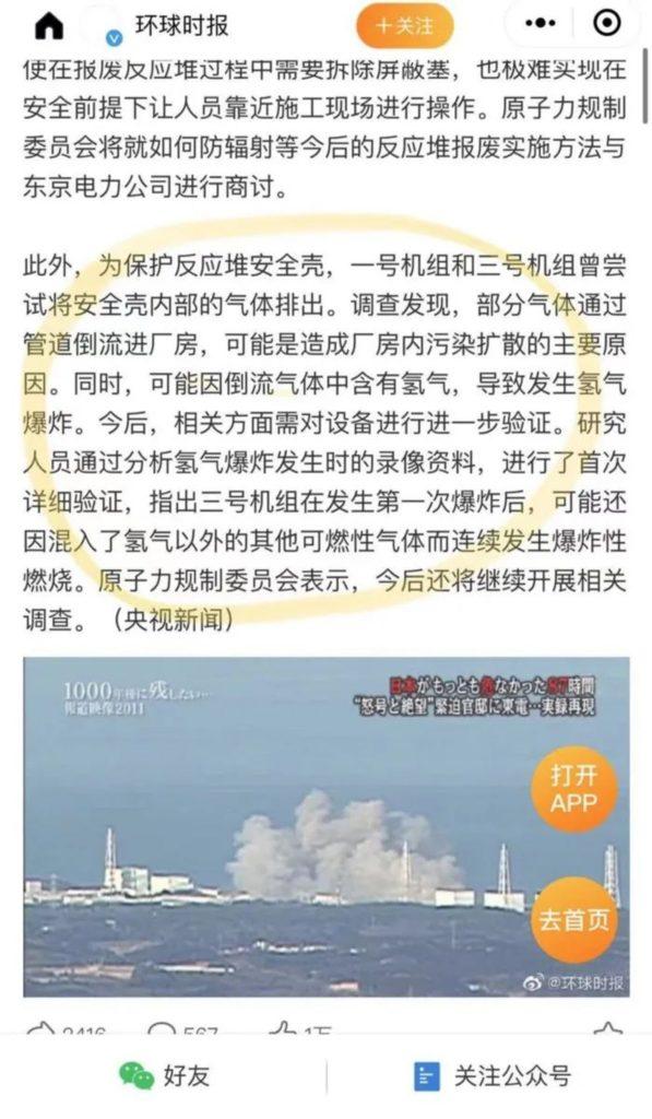 而《环球时报》引述的翻译里则说,一号和三号机组核反应堆压力容器排出的部分气体,通过管道倒流进厂房,可能因倒流气体中含有氢气。而有氢气则可能导致发生爆炸。但是在原文里,这个语句是在评估过去发生的情况,用的是过去式。汉语翻译中则把这句话当成了事实陈述。