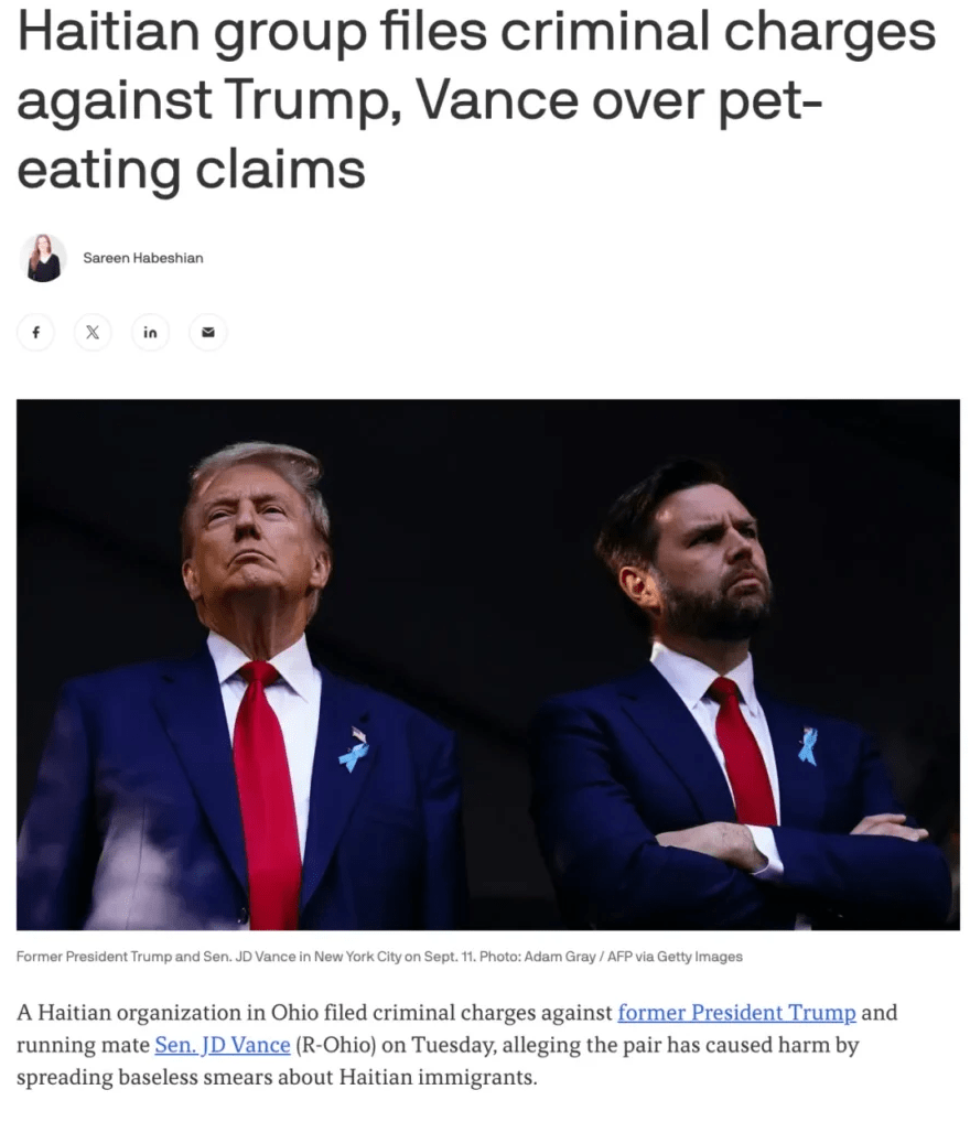 前不久,川普和万斯传播海地移民吃宠物的谣言,也已经为此吃上了官司。海地人社区的一个非营利组织在俄亥俄州克拉克郡法院将川普和万斯告上了法庭,指控这两人扰乱公共服务、制造虚假警报、电信骚扰、严重威胁和共谋。