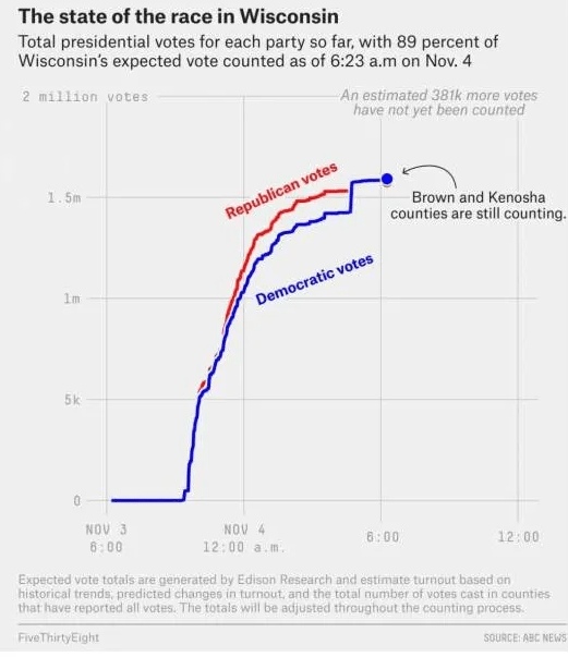 按照威斯康辛州法律,大部分大城市都在一个集中地点统计缺席选票,并一次性报告这些缺席选票的结果。因为,在该州人口最多的地区密尔沃基,直到凌晨3点左右才完成对约16.9万名缺席选民的统计。统计完成后,警方护送该市选举主管从中央计票地点来到县法院,送达了装有数据的U盘,并立即将这一批票纳入总票数统计。这就是11月4日凌晨3点56分突然增加了逾10万张拜登选票的原因。由于这些使用邮寄方式的大城市选民大多是拜登的支持者,导致数据网站FiveThirtyEight 自动抓取相关数据的可视化曲线图,出现了视觉上比较陡峭的增长。