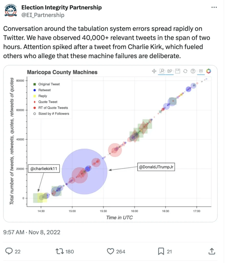 在2022年11月8日选举日当天,右翼组织美国转折点的创始人查理·柯克(Charlie Kirk)将马里科帕郡投票机发生的问题发布后,在推特上引发了大量关注。他说:“马里科帕的大多数投票站要至少等待两小时,在这里主持选举的民主党人知道会发生这种情况。这种延误是人为设计的。不要让他们再做一次2020年的事”,他的推文等于是暗指大选舞弊。