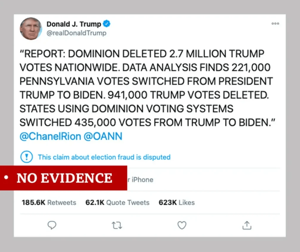 2020年大选结束后,川普声称Dominion投票机删除他的270万张选票,就是此类谣言的典型代表。无论是川普本人,还是之后跟进报道的福克斯新闻(Fox News)都没有任何证据来证实投票机对选票的统计有误。